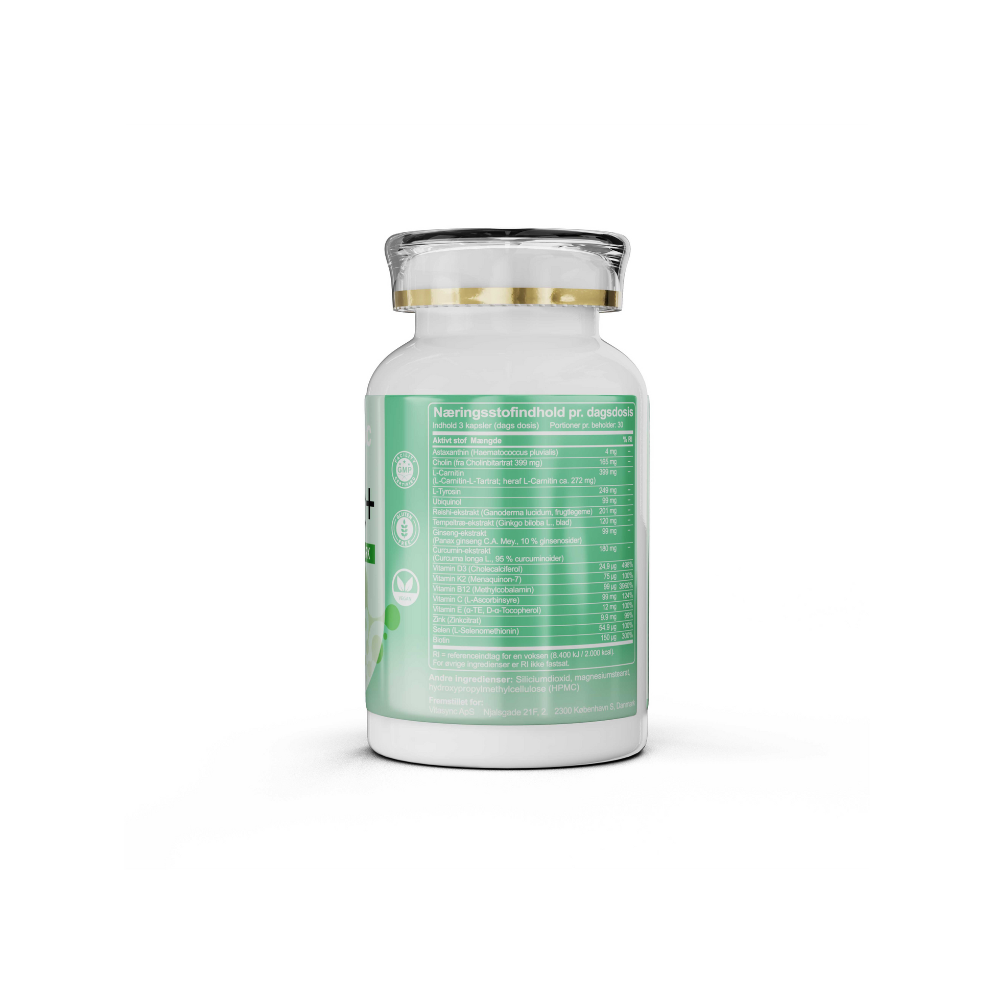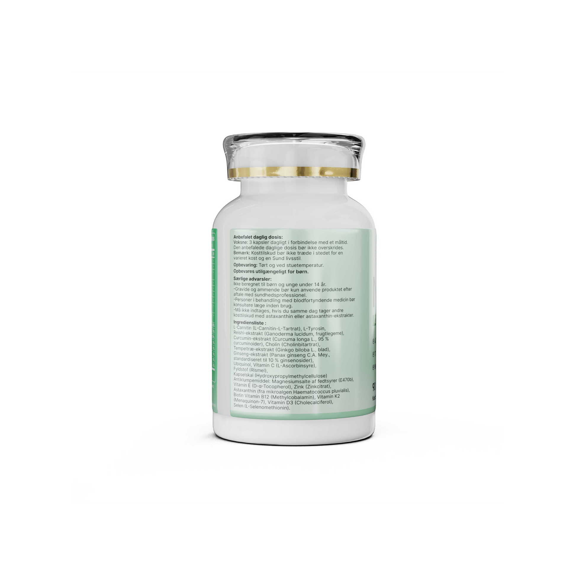 Formlen består af en kombination af vitaminer, mineraler, antioxidanter og adaptogener – bl.a. Astaxanthin, Choline, L-Tyrosine, Ubiquinol (CoQ10), Reishi, Ginkgo Biloba, Panax Ginseng, Curcumin, Vitamin D3, Vitamin K2, Vitamin B12, Vitamin C, Vitamin E, Zink, Selen og Biotin. Alle ingredienser er nøje doseret i sikre og effektive mængder.
